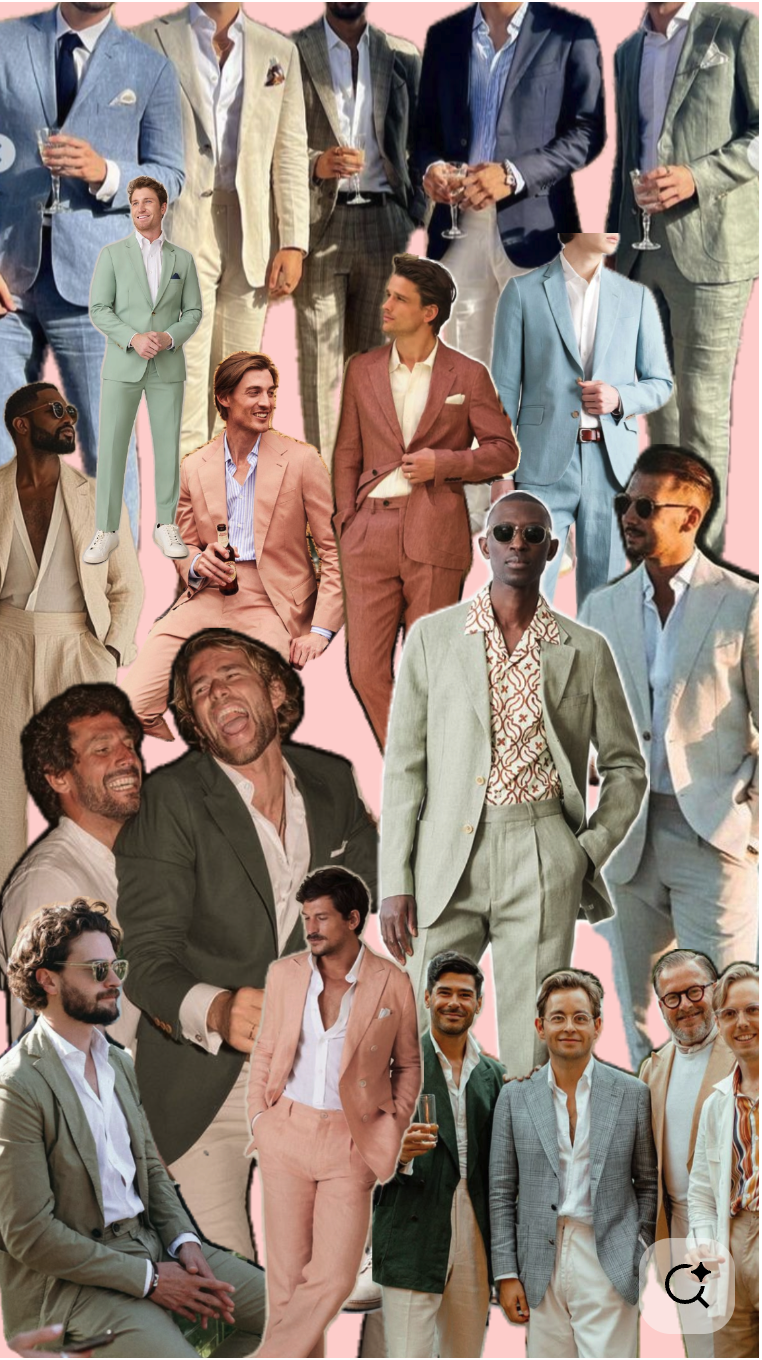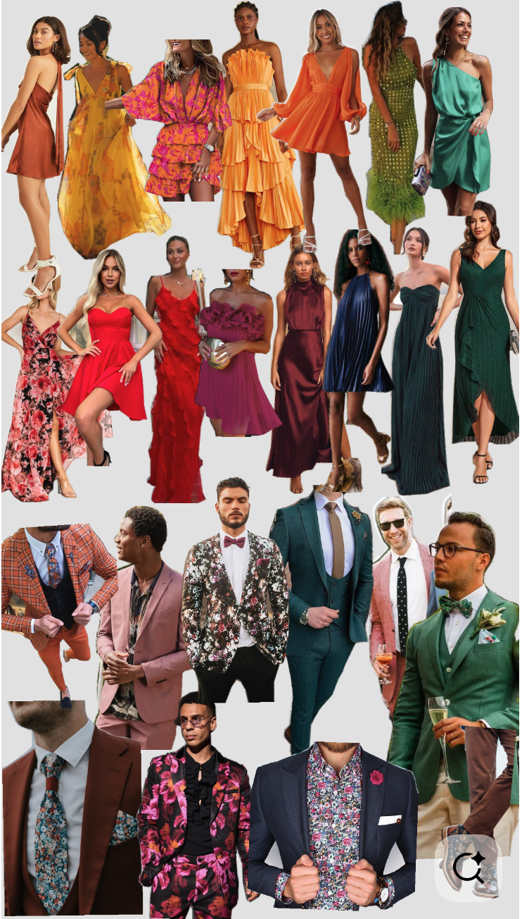 Think knee, tea-length, or maxi dresses, dressy jumpsuits, or suits with or without a tie.